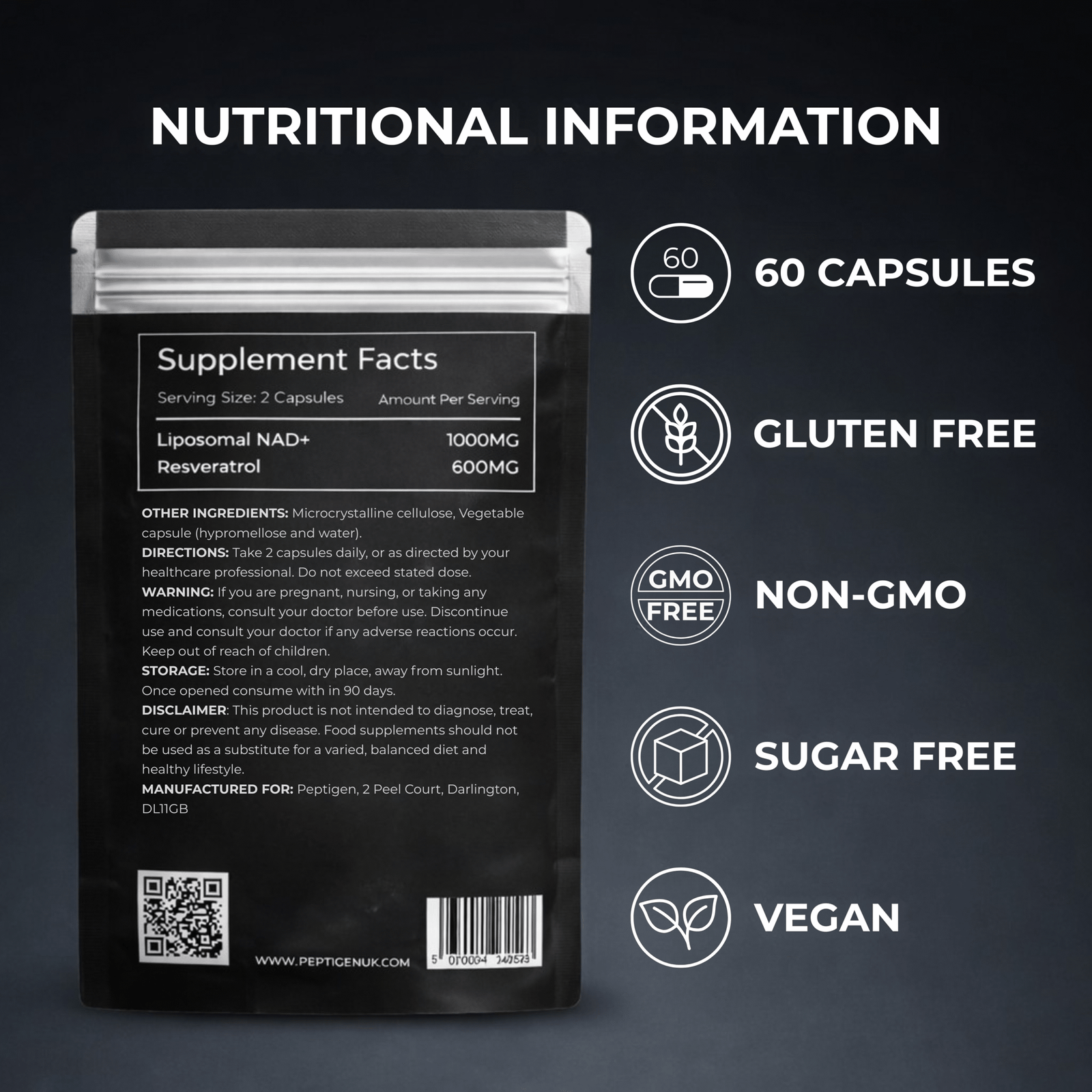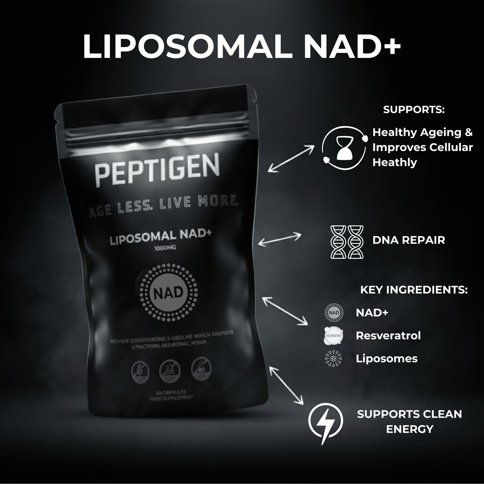 PEPTIGEN Liposomal NAD+ with added Resveratrol is a synergistic blend of bioavailable NAD⁺ and antioxidant-rich Resveratrol encapsulated in liposomal delivery for superior absorption. By protecting these ingredients inside microscopic phospholipid spheres (liposomes), we enhance uptake into your cells bypassing the digestive breakdown that limits conventional supplements.